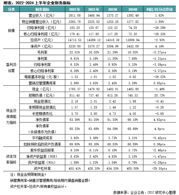2024上半年保利发展实现营业收入1392.49亿元,同比增长1.62%;预收房款达到3535亿元,后续待结算收入储备较为充足。利润方面,企业实现毛利润223.08亿元,同比减少23.5%;归母净利润74.2亿元,同比减少39.3%;扣除非经常性损益后的核心归母净利润为72.3亿元,同比减少38.3%。