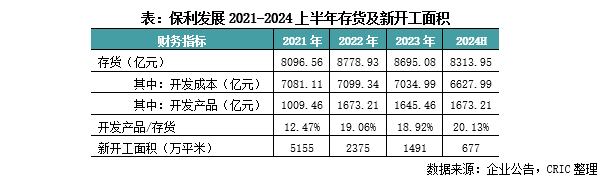 保利自2022年开始“以销定产”,企业的新开工面积从近年来最高的2021年的5155万平米开始逐年减少,2024上半年的新开工面积为626万平方米,仅为2023全年的45.4%;与此同时,上半年拿地也有所放缓,减少经营性现金流出的同时,也让企业在2024年上半年末的存货较期初减少了4.4%至8314亿元。但是,其中竣工物业(开发产品)规模增长了1.7%至1673.21亿元,对存货的占比也提高了1.21个百分点至20.13%,企业的去库存面临着一定的困难