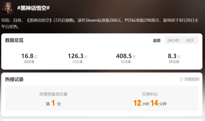 玩家们纷纷在社交媒体上分享自己的喜悦之情,奔走相告之后,“黑神话悟空”甚至冲上了热搜第一。