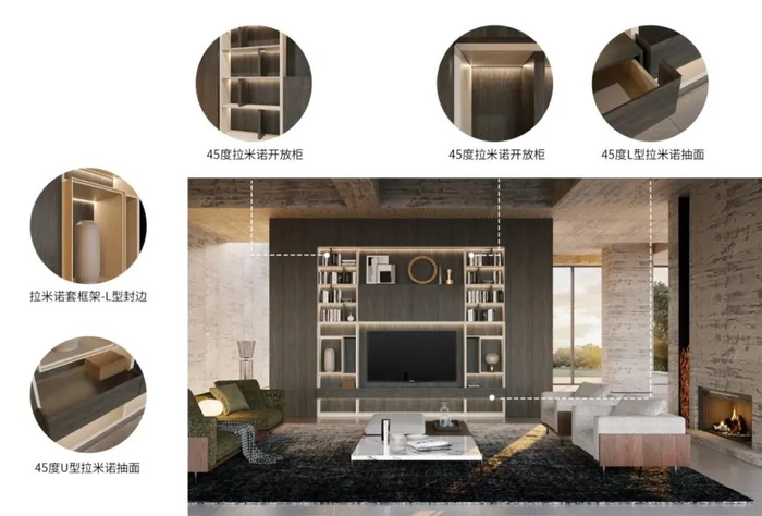应用连接结构:顶固拉米诺开放柜,45°斜角高定工艺,套格无缝外观柜体,整柜外观精致而高级。