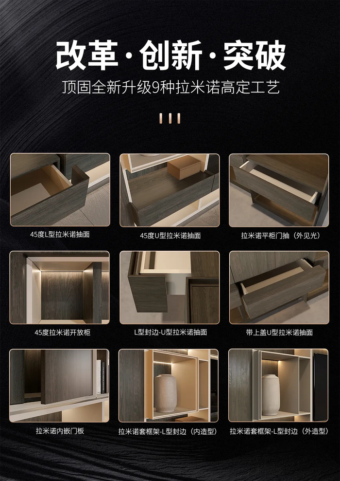 应用连接结构:顶固拉米诺抽面对比传统抽屉板式柜体结构传承创新,采用“隐孔+造型",45度U型拉米诺整柜外观抽面,隐形连接工艺,柜体四方无孔扣合。