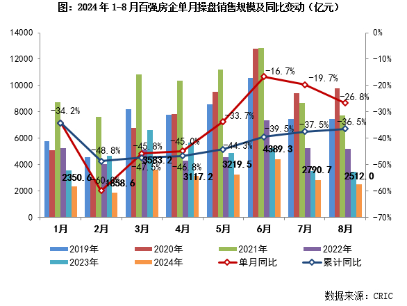 企业层面,8月TOP100房企实现销售操盘金额2512亿元,环比降低10%,单月业绩规模继续保持在历史较低水平。同比降低26.8%,同比降幅较7月进一步扩大7.1个百分点。累计业绩23821亿元,同比降低36.5%,降幅收窄1个百分点。