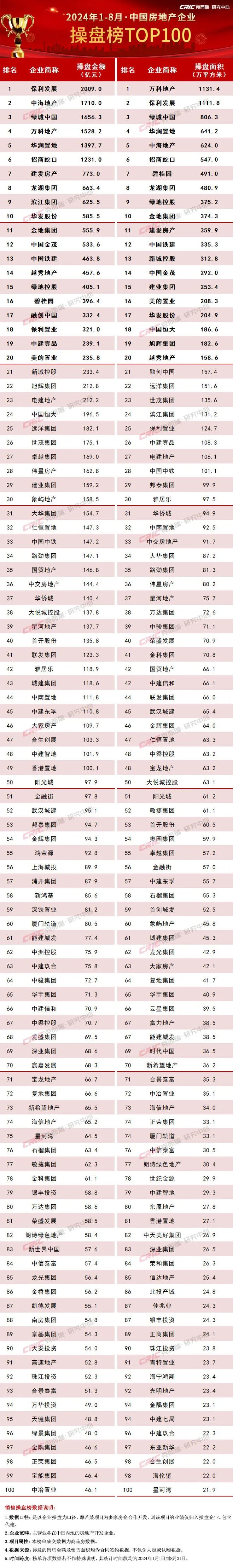 2024年1-8月中国房地产企业销售TOP100排行榜