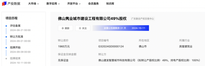 佛山隽业城建工程49%股权挂牌转让,底价为1960万元