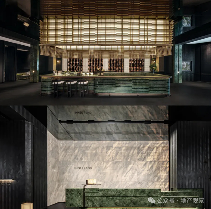 在负一楼,公区的吧台采用幽林松绿奢石,上方悬挂着东京安缦风格的灯笼,巧妙融合时尚与禅意。