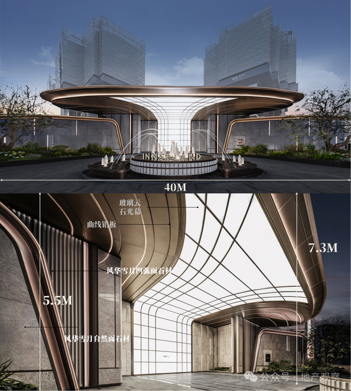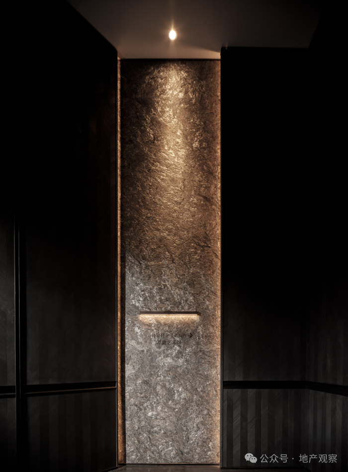 观萃的酒店式大门被巧妙的布置在项目转角处,能最大程度拓宽展示面。它以约40米的长度和约140平方米的玻璃云石光幕,营造出开阔而通透的视觉效果。门口的土耳其进口风花雪月奢石,通过匠人上万次手工捶打,确保了纹理的自然流畅与色泽的温润质感的同时,展现出独特的高奢气质。