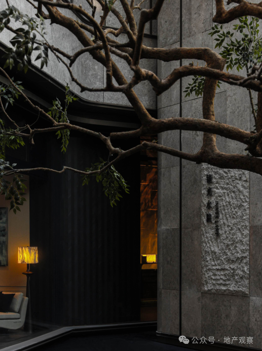 下沉会所打造的核心景观镜光水院,水景中央是一棵据传价值50W+的高山红花梨,也是西南首棵,树形奇特,充满禅意。
