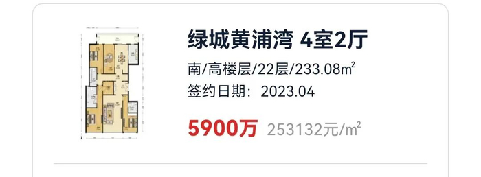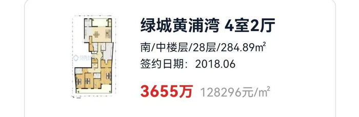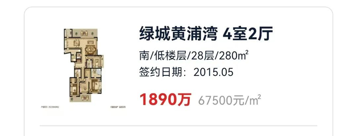 当然,最震惊整个上海滩二手豪宅市场的,应该是号称滨江第一豪宅的绿城黄浦湾了,前几天,这里上架了一套房子,406平米,中高层不看江景,挂牌价只要6800万。