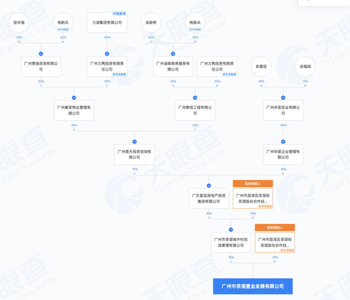 广东富坚房地产投资集团有限公司由广州晋天投资咨询有限公司持股75%,广州晋天投资咨询有限公司由广州豪安物业管理有限公司持股80%,广州豪安物业管理有限公司由广州景强咨询有限公司、广州力隽投资有限责任公司分别持股50%。广州景强咨询有限公司由杨新兵、张华强分别持股50%,广州力隽投资有限责任公司由力诚集团有限公司持股100%。
