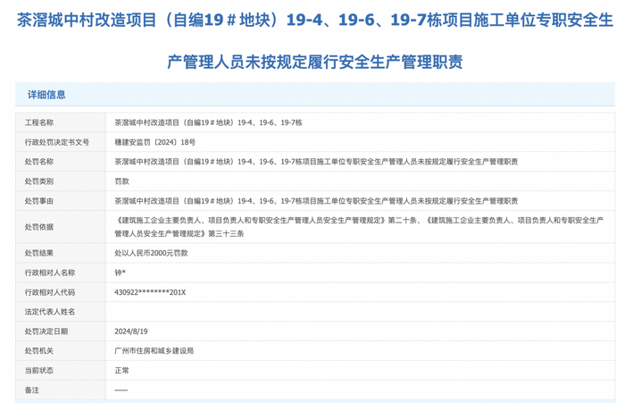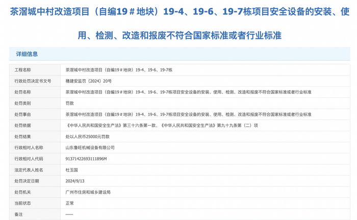 值得注意的是,据广州市住房和城乡建设局官网-阳光家缘网站显示,茶滘城中村改造项目(自编19#地块)近2个月被行政处罚两次,行政处罚事由分别是:“茶滘城中村改造项目(自编19#地块)19-4、19-6、19-7栋项目安全设备的安装、使用、检测、改造和报废不符合国家标准或者行业标准”、“茶滘城中村改造项目(自编19#地块)19-4、19-6、19-7栋项目施工单位专职安全生产管理人员未按规定履行安全生产管理职责”。