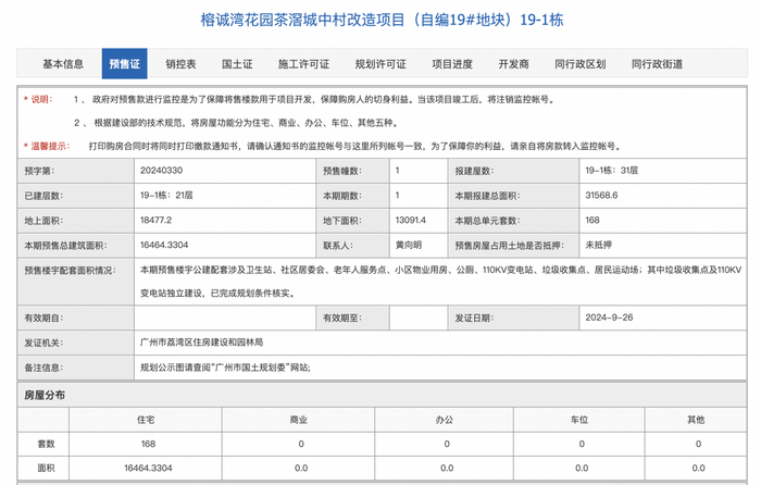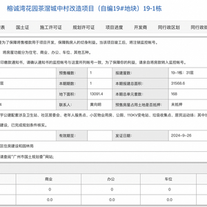房情报 刘治颖 9月26日,据广州市住房和城乡建设局官网,力诚榕诚湾(备案名:榕诚湾花园)获得一张预售证,批准预售套数为168套,批准预售面积合计为1.65万㎡,开发商为广州市茶滘置业发展有限公司。