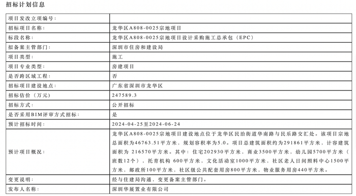 据了解,今年2月底中建壹品+湖北文旅联合体以51.79亿元拿下龙华A808-0025宗地,已定名“鹏宸云筑”,开发商为深圳华展置业有限公司(中建壹品、湖北文旅各持股65%、35%),这也是中建壹品在深圳的首个项目。