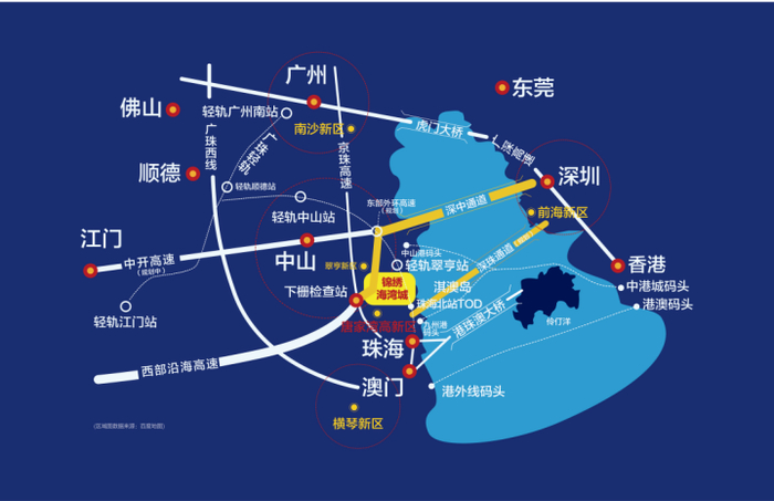 事实上,当前已建成运营的广珠城轨翠亨站亦设于锦绣海湾城六期旁边数百米,通过城轨,向南可达珠海拱北口岸,畅联香港、澳门;向北可达广州南站,通达全国。而项目亦紧邻珠海,饭后散步即可达珠海唐家湾新区,优质产业资源举步可及。