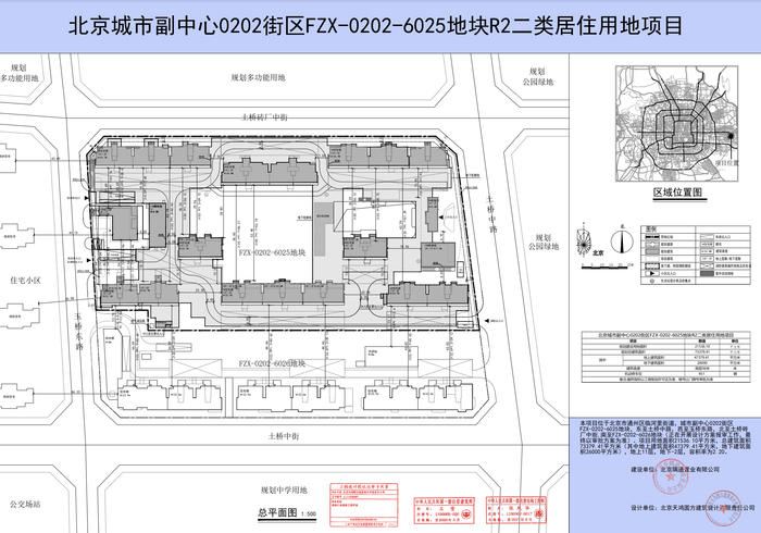 项目位于通州临河里街道,东至土桥中路,西至玉桥东路,北至土桥砖厂中街,南至6026安置房地块,建设用地约2.15公顷,为R2二类居住用地,总建筑面积约7.34万平方米,容积率2.2,地上11层,地下-2层,建筑高度30米,局部36米。