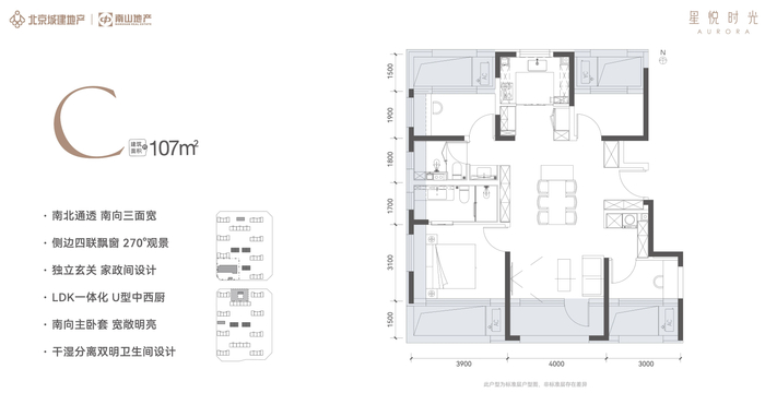 建筑面积约107㎡的四室两厅两卫,套内面积占比约81.57%,南北有4个挑空和设备平台,南面1个封闭阳台,侧面4个飘窗,实际使用面积约128㎡,实际可使用率101.5%。