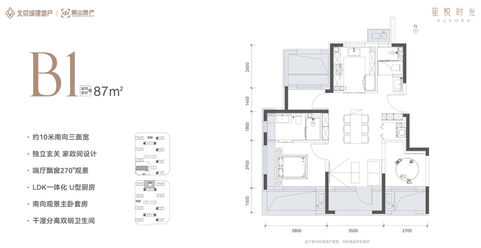 建筑面积约87㎡的三室两厅两卫中间户,套内面积占比约78%,中户拓展面积约18.74㎡、边户约22.23㎡,南北有3个挑空和设备平台,南面有1个封闭阳台,边户侧面有2个飘窗,中户的实际使用面积约106.29㎡、边户约110.4㎡,中户实际可使用率99.6%、边户103.5%。