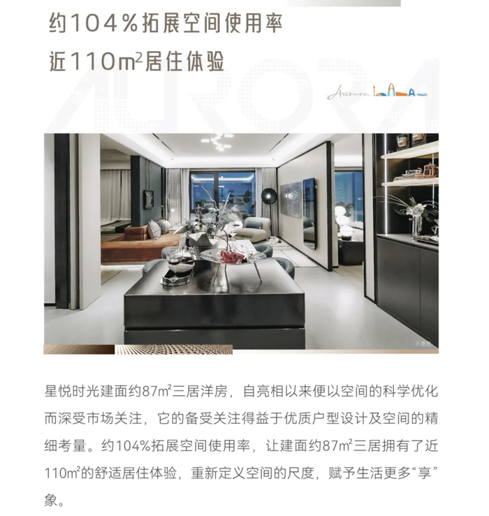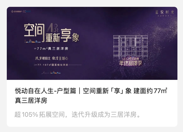 按照大多数项目80%左右的得房率计算,一套建筑面积约为77㎡的三居室,星悦时光的实际可用面积将比一般情况多出35㎡,用项目官微的推广话术来讲,就是:超105%拓展空间,迭代升级成为三居洋房。