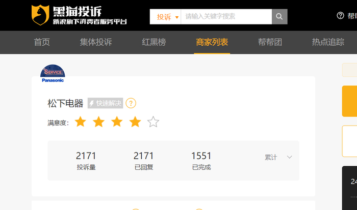 黑猫投诉平台显示,松下电器累计投诉量2171条,已回复2171条,已完成1551条。
