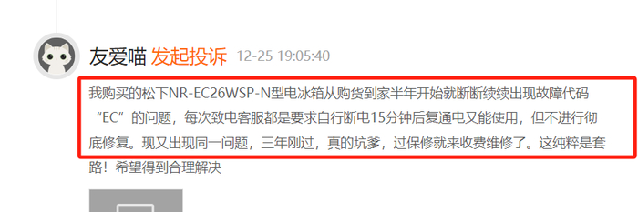 松下电冰箱也因产品质量问题遭消费者投诉。12月25日,有消费者投诉称,其购买的松下NR-EC26WSP-N型电冰箱从购货到家半年后开始断断续续出现故障代码“EC”的问题,每次致电客服都是要求自行断电15分钟后复通电又能使用,但不进行彻底修复。