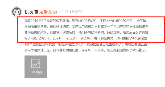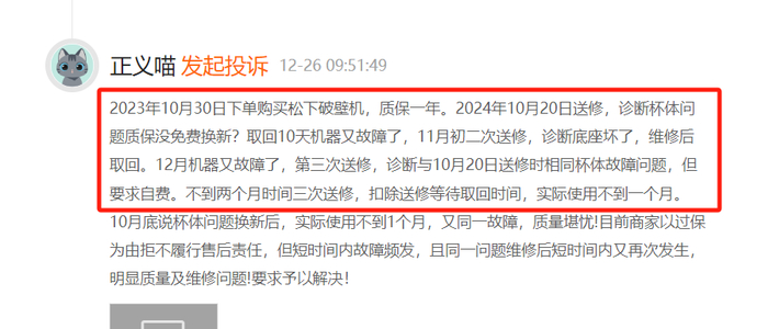松下旗下破壁机、洗衣机等多个产品遭消费者投诉。一名消费者投诉表示,其于2023年10月30日下单购买松下破壁机,质保一年。2024年10月20日送修,诊断杯体问题,取回10天机器又故障,11月初二次送修,12月机器又故障了,第三次送修,诊断与10月20日送修时相同杯体故障问题,但要求自费。