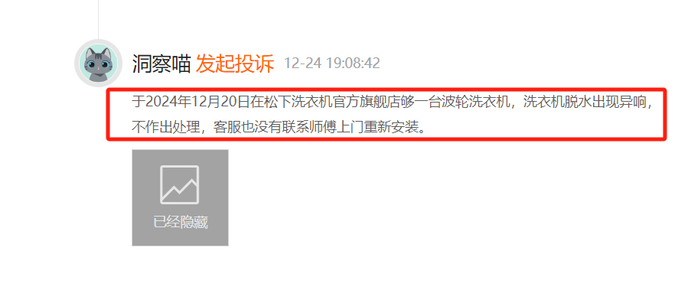 12月24日,一名消费者投诉表示,其于2024年12月20日在松下洗衣机官方旗舰店购买一台波轮洗衣机,洗衣机脱水出现异响。