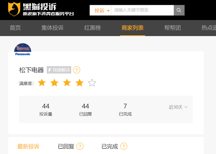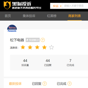 乐居财经 12月26日,据黑猫投诉平台,松下电器近30天新增44条投诉,已完成7条,已回复44条,投诉问题涉及产品质量等。