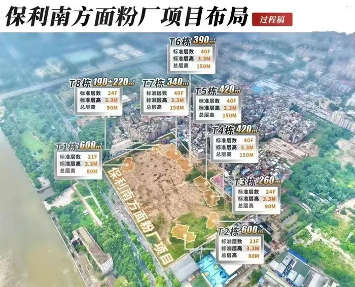 其中,未拍先火的保利南方面粉厂和绢麻厂地块项目,无疑是市场关注的焦点。近日,据媒体报道,保利南方面粉厂项目的规划布局、产品面积段出炉,拟建8栋住宅,将采用半围合式布局,纯板楼设计,楼高21-40层。