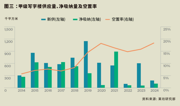 莱坊董事及上海和北京研究及咨询部主管杨悦晨表示:“尽管2024年搬迁需求较为旺盛,但新租需求明显不足,加上租户退租及缩租的情况较为普遍,平均空置率水平上升,租金下行。另一方面,由于企业持续的降本增效需求,部分甲级写字楼租户开始倾向于选择乙级或更低级别的写字楼,这也导致了甲级写字楼市场的客户流失。综合以上因素,2024年第四季度全市甲级写字楼的平均空置率继续环比上涨0.8个百分点至18.4%。”