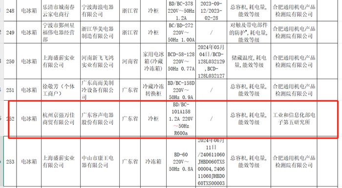 其中标称广东容声电器股份有限公司(以下简称“容声电器”)生产的冷柜,规格型号为BD/BC-101A1581.2A 220V~50HzR600a产品抽检不合格,主要不合格项目为总容积、耗电量、能效等级。