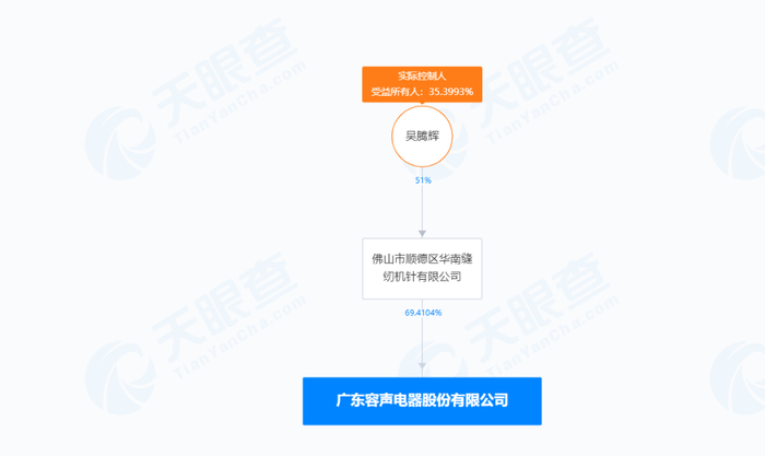 天眼查显示,容声电器成立于1997年,注册资本1.42亿元,法定代表人林凤莲,经营范围含家用电器研发;厨具卫具及日用杂品研发;卫生洁具研发等。目前,该公司由佛山市顺德区华南缝纫机针有限公司持股69.4%,后者由吴腾辉、吴燕敏、刘宁共同持股。股权穿透发现,其实控人为吴腾辉控股约35%。