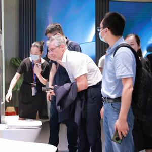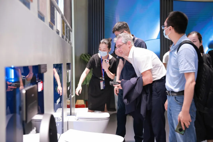 2024年5月的中国国际厨卫展期间,九牧集团的展台上迎来了不少体验产品、拍照录像和做笔记的国际友商。