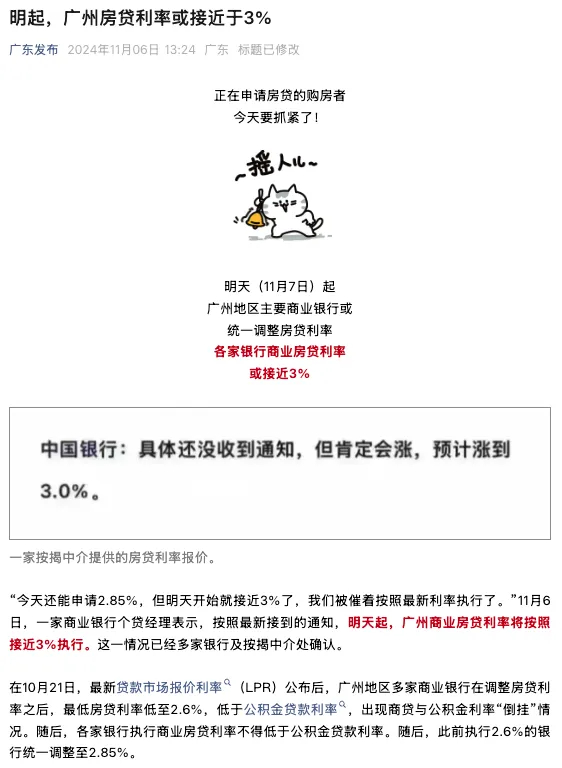 2024年底广州部分区域商业银行最低房贷利率低至2.6%,曾出现商贷与公积金贷款利率“倒挂”情况。为此2024年11月6日,广东省人民政府新闻办公室官方微信“广东发布”发文曾表示:多家银行及按揭中介确认,自11月7日起广州地区主要商业银行或统一调整房贷利率,各家银行商业房贷利率最低不得低于3%。
