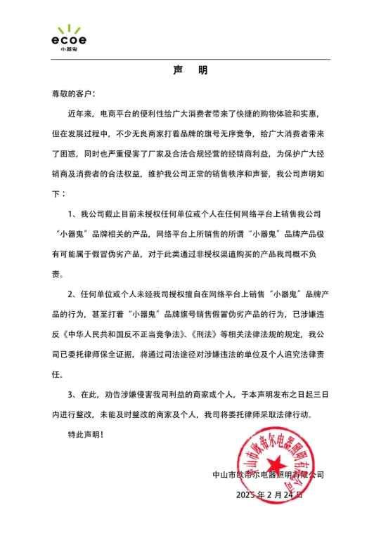 2月24日,小器鬼照明在其官微发布声明,称公司截至目前未授权任何单位或个人在任何网络平台上销售其公司“小器鬼”品牌相关的产品,网络平台上所销售的所谓“小器鬼”品牌产品极有可能属于假冒伪劣产品,并劝告涉嫌侵害其利益的商家或个人于本声明发布之日起三日内进行整改,否则将采取法律行动。