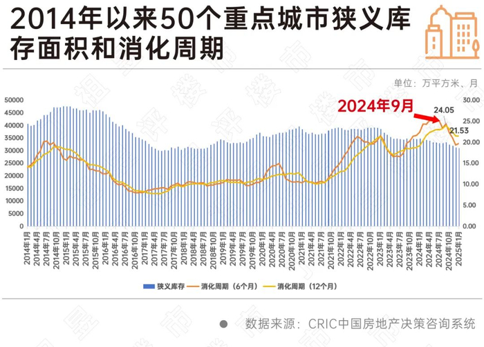 CRIC数据显示,截至2025年1月末50个重点城市狭义库存同比下降11%。其中多个重点一二线城市去化周期仍超20个月。