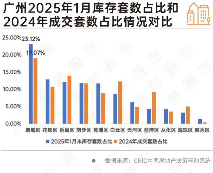 考量到2025年1月单月或有偶发性因素影响,我们选取了2024年全年成交结构进行对比,可以看出广州增城区、武汉东西湖区2025年1月库存套数占比均显著高于2024年成交套数占比,存在显著的供大于求情况。