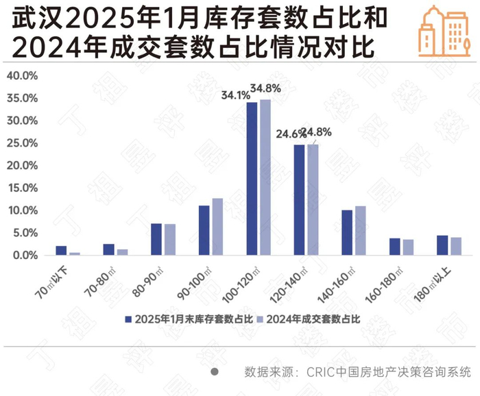 武汉成交结构和库存结构高度趋同,成交结构同样以100-120平和120-140平为主,占比分别为34.8%和24.8%,其余面积段也无明显供需错配情况。