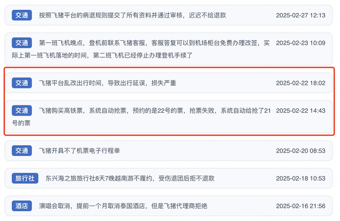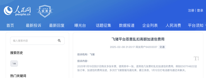 还有消费者称,其于2025年1月19日至21日购买多张车票,使用其中一张,其他几张票办理退票时,发现有加速包的费用且没退,多次与飞猪客服沟通无果。