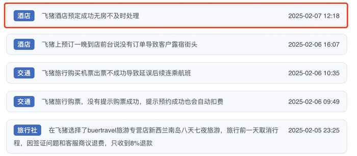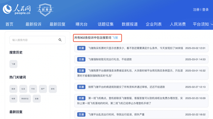 在人民网投诉平台上搜索发现,共有902条投诉中包含搜索词“飞猪”,投诉的内容涉及更改出行时间,预定酒店成功后、无房不及时处理等。