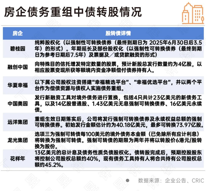如花样年将13亿美元的总计息及债务性质负债股权化。债转股完成后,预期控股股东将控制公司股权总额约40%,现有债务工具持有人将合共持有公司股权总额约45.2%;远洋集团发行强制可转换债券及永续权益总额的强制可转换债券。初始发行金额估计约为40.18亿美元,最多可转换73.97亿股。