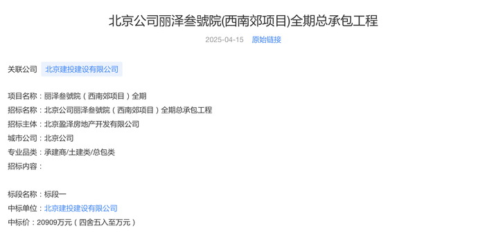 4月14日,北京建投建设公示中标中海丽泽叁號院全期总承包工程,中标价为2.09亿元。