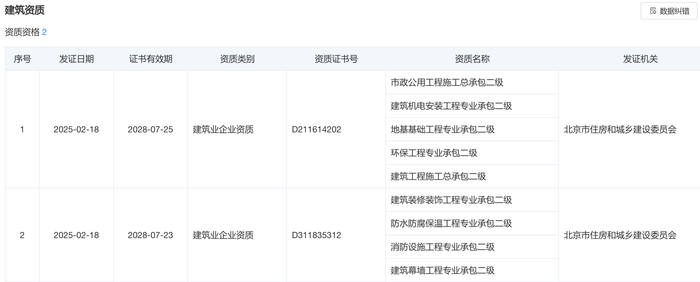 同时,取得建筑工程施工总承包二级、建筑装修装饰工程专业承包二级等一系列建筑业企业二级资质证书。