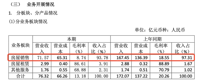 分业务板块来看,房屋销售收入为71.57亿元,同比减少57.26%;而房屋租赁收入为2.99亿元,其他服务收入为1.76亿元,均有所增长。