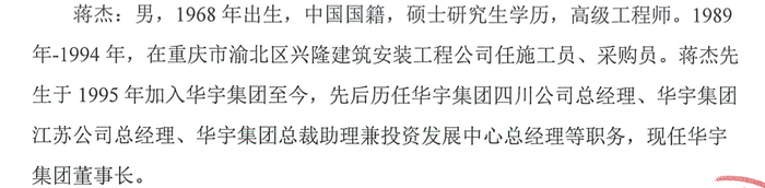 公开资料显示,蒋杰出生于1968年,硕士研究生学历,高级工程师。其与原董事长蒋业华为亲属关系,同时还是出资成立华宇集团的初始成员之一。