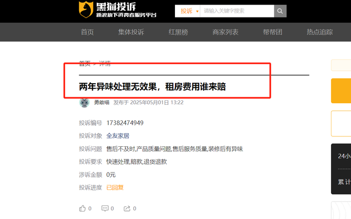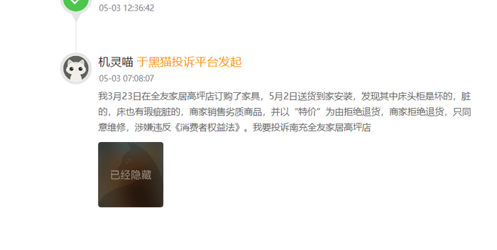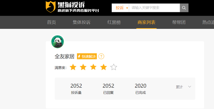 截至5月13日,全友家居在黑猫投诉平台投诉量累计超2000条。