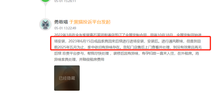 另一位消费者反映,其于2022年3月在全友家居离石滨河街道店签订了全屋定制合同,同年10月18日全屋定制开始进场安装,2023年6月15日成品家具回来后续进行进场安装。通风散味至今,直至2025年5月家中仍有异味。