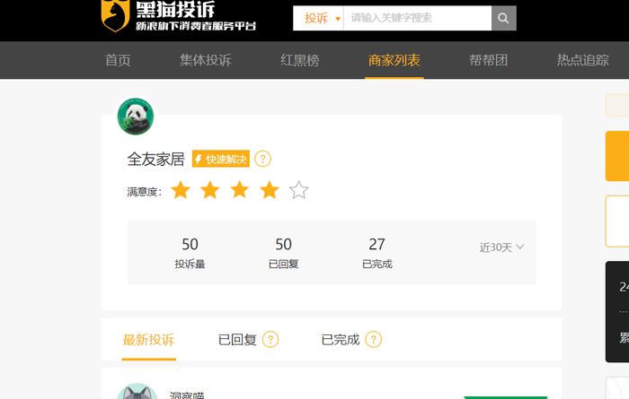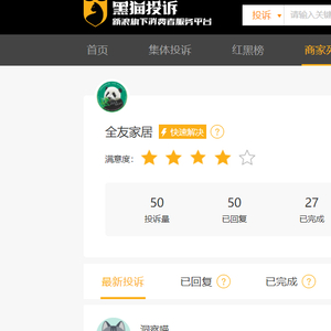 乐居财经 严明会 5月13日,据黑猫投诉平台,全友家居近一个月新增投诉量50起,已完成27起,投诉问题多涉及产品质量及售后服务等。