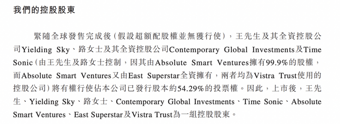 因此,上市后,王勤松、YieldingSky、路长梅、ContemporaryGlobal Investments、TimeSonic、AbsoluteSmartVentures、EastSuperstar及VistraTrust为一组控股股东。王勤松与路长梅系夫妻关系。
