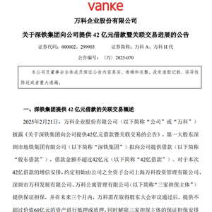 公告显示,万科在今年2月21日披露《关于深铁集团向公司提供42亿元借款暨关联交易的公告》,深铁集团拟向万科提供借款,借款金额不超过42亿元。
