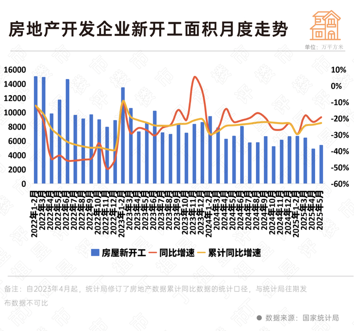 1—5月份,房屋新开工面积23184万平方米,下降22.8%。其中,住宅新开工面积17089万平方米,下降21.4%。