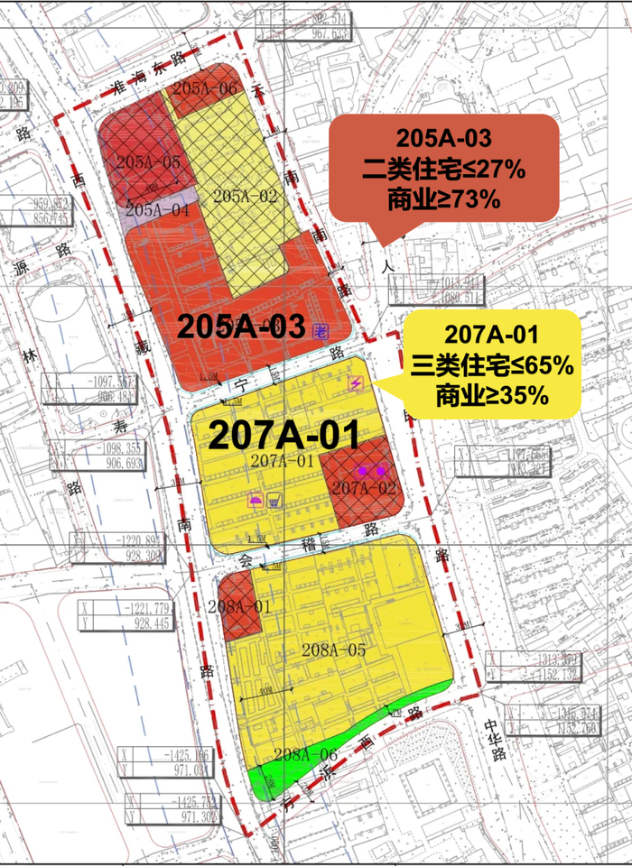 北侧205A地块限高16米(产品预计以风貌住宅为主);中间207A地块限高100米(产品预计以高层住宅+风貌住宅为主);南侧208A地块限高170米(产品预计以超高层住宅+风貌住宅为主)。